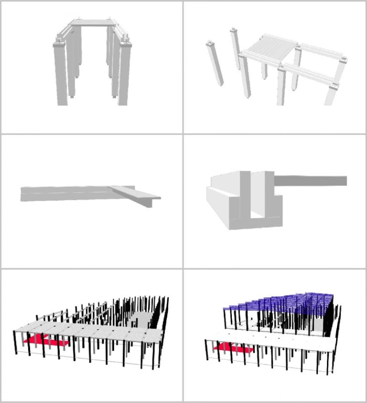 The shell beams are erected onto the pile caps (L1) and onto the column corbels (L3) using post-tensioning within the shell. They’re then infilled, making the beams a solid rectangular continuous beam. The concept reduces the precast beam weight while providing continuity for the beam frame system, allowing for a reduction in the beam’s structural depth. The T-Slab precast is then placed on the adjacent shell beams with a structural topping.